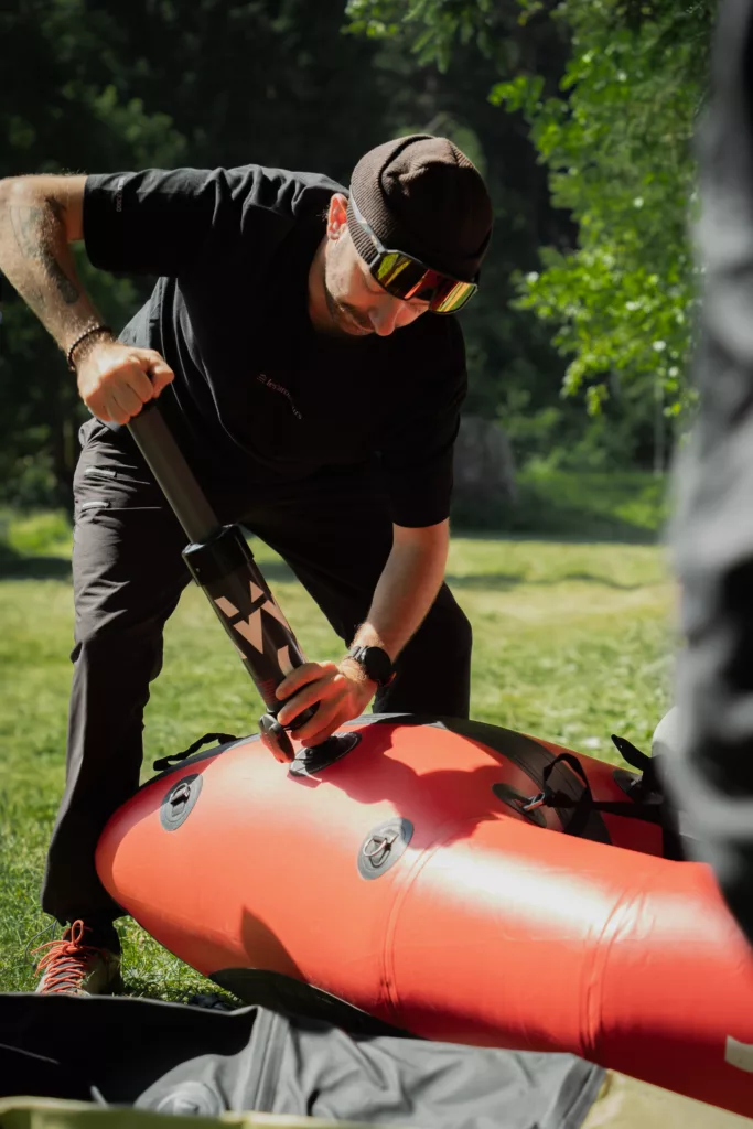 Gonfler, c’est facile. Régler, c’est tout le reste. Le packraft se pilote mieux quand on est soudé à lui : sangles de genoux, dosseret, siège… tout compte. Bien calé dans son packraft, on lit mieux la rivière, on encaisse mieux les chocs, on garde la pagaie là où il faut. Mal réglé, c’est la rivière qui décide. Et la rivière… elle ne demande jamais votre avis !