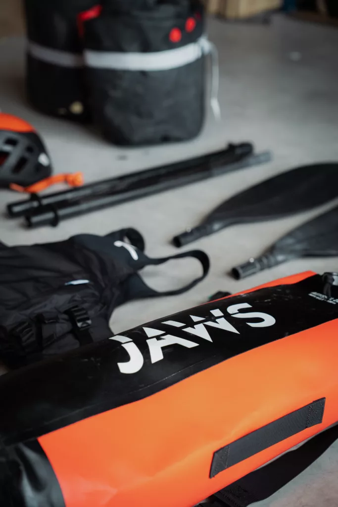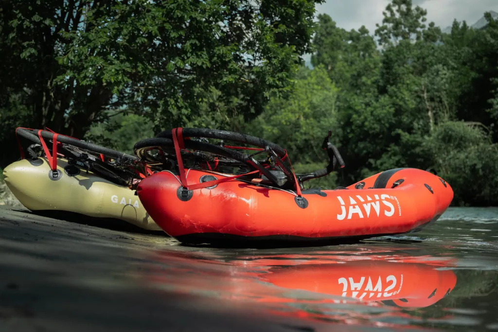 À cela s’ajoute un packraft léger et robuste (coucou JAWS !), que vous fixez sur le cintre de votre vélo ou sur un rack. Côté pagaie, le plus simple reste un modèle démontable en quatre parties : facile à transporter et à fixer quand vous pédalez. La sécurité, elle, ne se négocie pas : gilet de sauvetage et casque obligatoires. Ajoutez à cela un petit sac étanche pour mettre toutes vos affaires, une paire de chaussures d’eau et vous êtes prêts pour vous lancer !